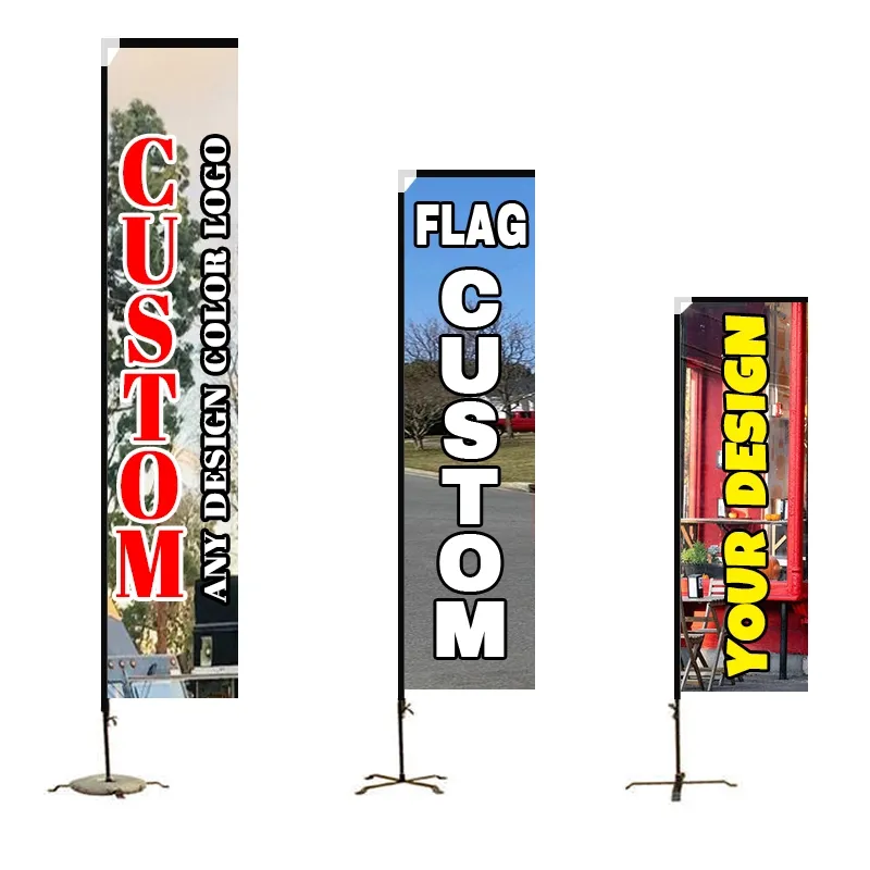 Bandeira de praia retangular, bandeira de topo plano, com formato retangular, também conhecida como bandeira de bloco, bandeira de borda ou bandeira telescópica, pode fazer com que a bandeira seja exibida lindamente a qualquer momento. Bandeiras retangulares têm área de impressão maior do que bandeiras em forma de lágrima ou bandeiras de penas, adequadas para mensagens de marketing e branding de alto impacto.
